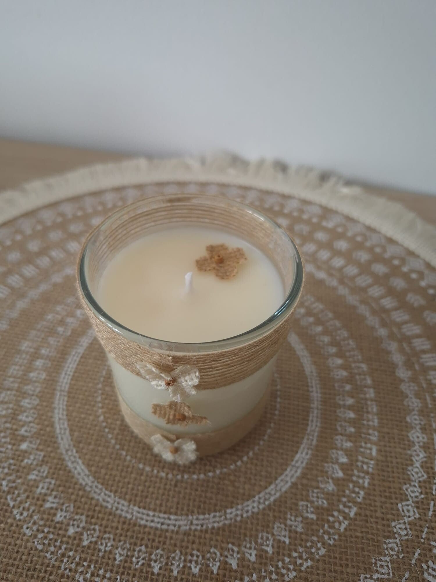 Habillée de ficelle et ornée de petites fleurs en toile de jute, son pot est décoré à la main par mes soins, ce qui rend chaque pièce unique et pleine d’authenticité.